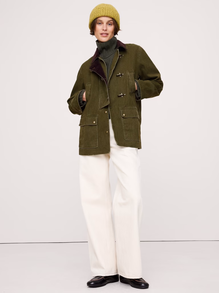 - Denim Trapeze Jacket w/ Cord Collar, $160 Love the shape.